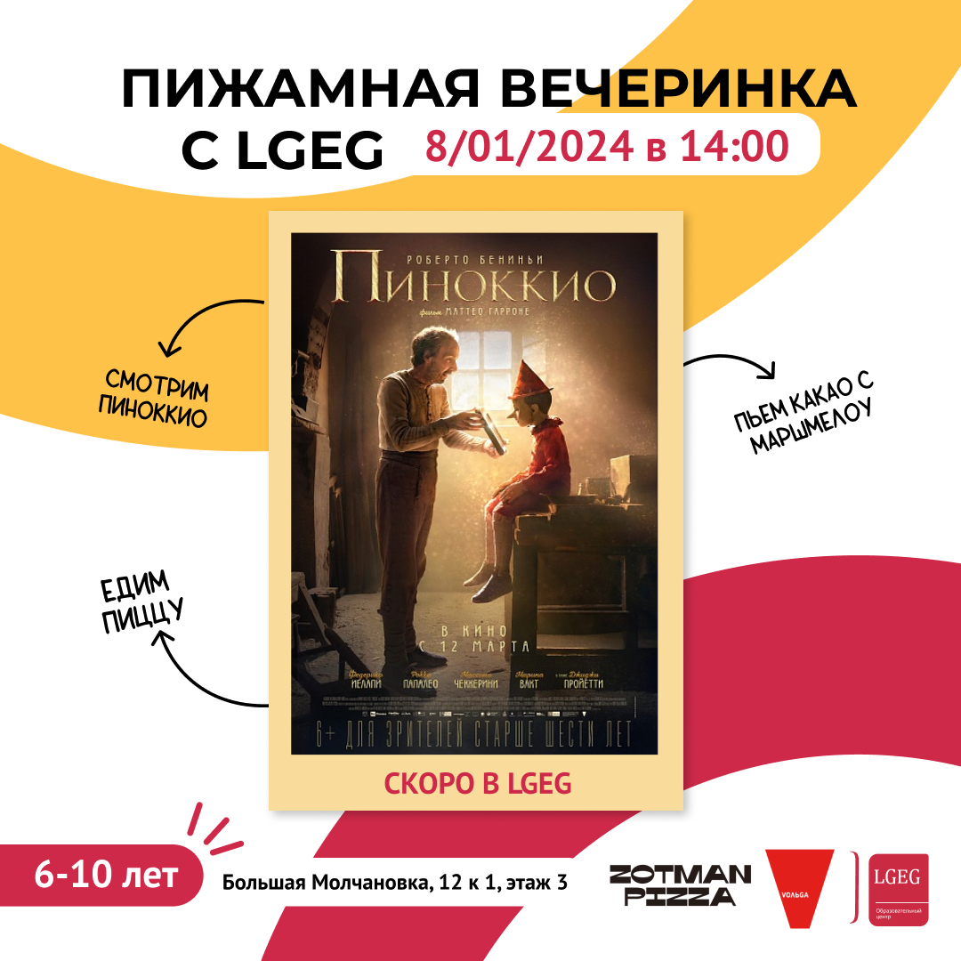 8 января в 14:00 встречаемся в уютной атмосфере центра LGEG в пижамах и тапочках, чтобы вместе провести последний день каникул за просмотром фантастического фильма «Пиноккио» от кинокомпании Вольга.